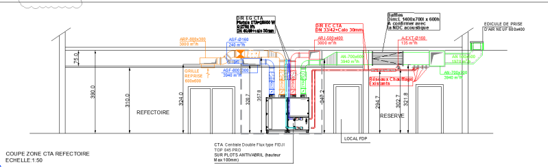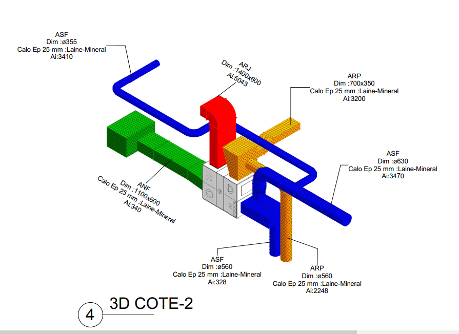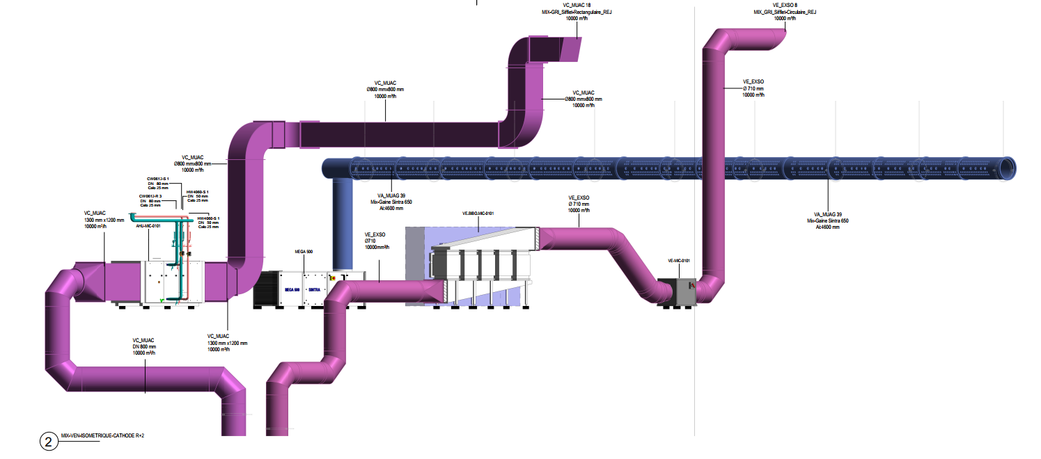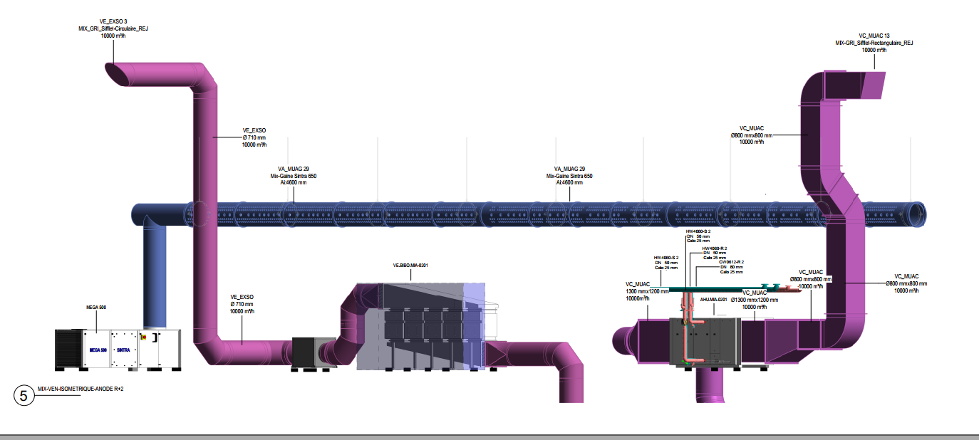 Tracé complet des gaines de ventilation, désenfumage, climatisation.